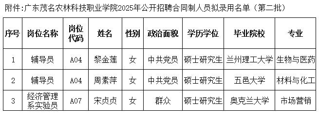 附件:广东茂名农林科技职业学院2025年公开招聘合同制人员拟录用名单(第二批)