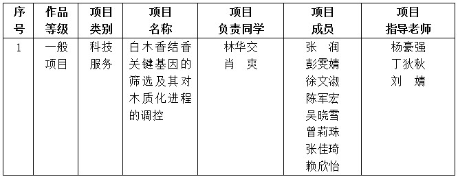 根据团省委《关于开展2026年广东省科技创新战略专项资金(大学生科技创新培育)项目申报的通知》和《关于组织申报2026年广东省科技创新战略专项资金(大学生科技创新培育)项目的实施方案》要求,经各项目组自主申报、资格审核、校内专家评审确定,拟推荐《白木香结香关键基因的筛选及其对木质化进程的调控》项目参加2026年广东省科技创新战略专项资金(大学生科技创新培育)项目申报,现予以公示,公示期为2026年1月12日至2026年1月16日。