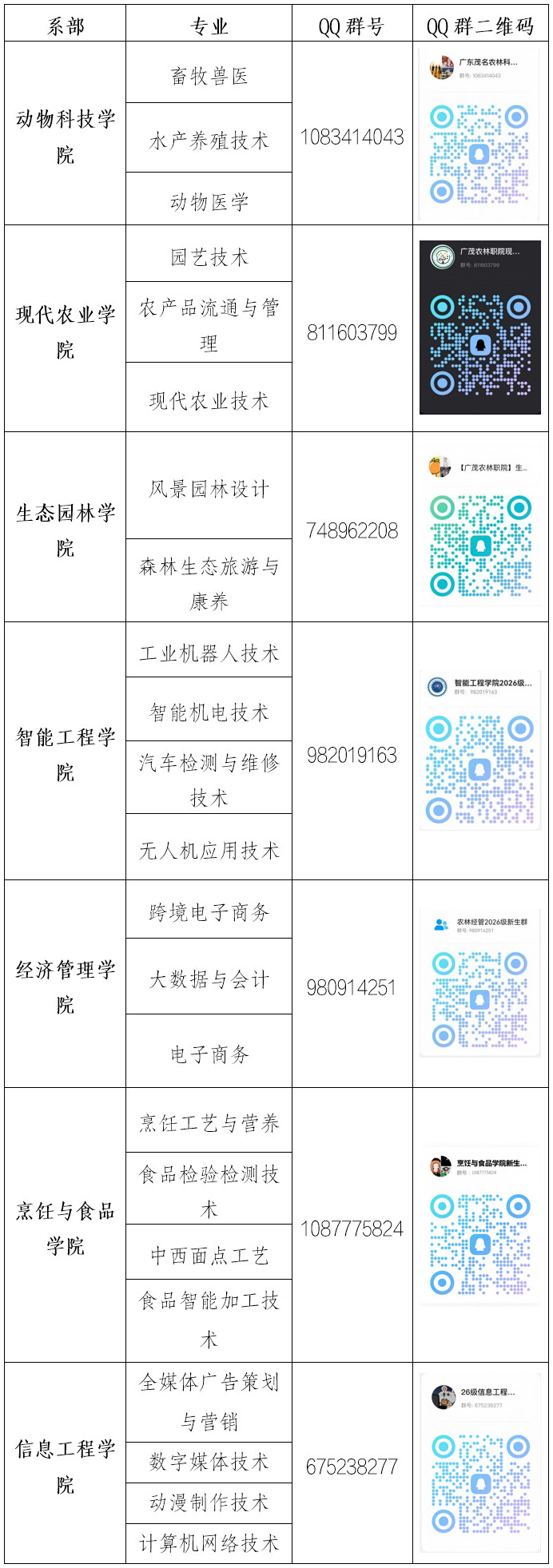 为了更好地给新生解答学校的相关情况,我校各二级学院开设了2026年新生咨询QQ群,各位已被我校录取的2026级新生,可根据查询的录取专业,扫码添加对应的二级学院QQ群(如下图)。