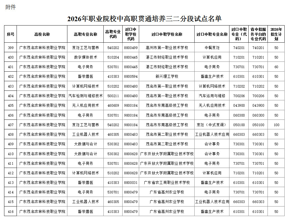 根据《广东省教育厅 广东省招生委员会办公室关于开展2026年职业院校中高职贯通培养三二分段试点工作的通知》(粤教职函〔2026〕5号)文件要求,经省厅审核,我校现确定与9所中职学校在18个专业点开展三二分段试点,招生计划共960人,具体情况如下: