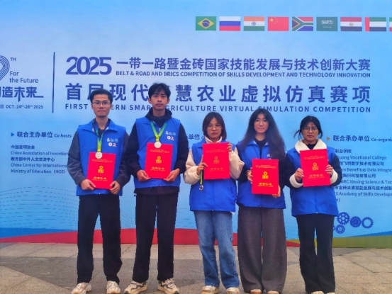 2025年10月24日,2025一带一路暨金砖国家技能发展与技术创新大赛——首届智慧农业虚拟仿真赛项全国总决赛在山东枣庄职业学院正式拉开帷幕。本次大赛汇聚了来自全国23个省、自治区、直辖市的300支参赛队伍,涵盖本科组、高职组、中职组和教师组,竞争激烈。经过多轮角逐,我校师生凭借扎实的专业知识、娴熟的虚拟仿真操作能力和出色的团队协作精神,在高职组和教师组中表现优异,斩获多项荣誉。现代农业学院学生郑子洛、叶莹颖获得二等奖,阙海霞、曹康慧获得优秀奖;指导教师蔡紫玲、朱启明荣获“优秀指导教师”称号;朱启明在教师组比赛中荣获二等奖。凭借出色的整体表现,我校还被授予“优秀组织奖”。